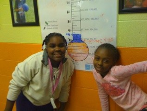 Jessalyn and Chontealice show off their progress in changing incadescent bulbs for CFLs. They’re also measuring energy saved and carbon dioxide emissions eliminated.